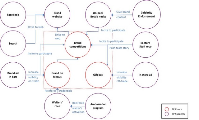 -Une synergie explicite entre les touchpoints : une fois les touchpoints pivots définis, il s’agit ensuite de définir les touchpoints dits support, ceux qui ont un rôle secondaire mais qui, comme dans un bon roman ou un bon film, vont apporter du relief aux touchpoints pivots, vont les nourrir et élargir leur caisse de résonnance. Ce faisant, les touchpoints support peuvent aussi permettre de toucher des cibles particulières ou compléter un dispositif au bénéfice d’une innovation produit