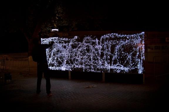 Water Light Graffiti est un projet de création d'un matériau composé de plusieurs milliers de LED s'illuminant au contact de l'eau. La quantité d'eau déposée autour de la LED détermine sa brillance : plus il y a d'eau, plus la LED brille intensément.