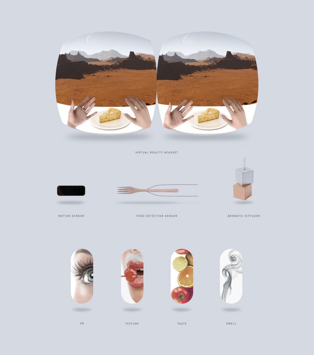 Pour duper son cerveau et son estomac, il a élaboré un système combinant plusieurs objets à la fois virtuels et matériels et afin de nous immerger dans une atmosphère où tous nos sens sont stimulés et surtout réceptifs. Ainsi, la nourriture serait remplacée par des aliments ressemblant à des gommes ou des gélatines de formes géométriques, composées d’ingrédients dérivés d’algues, de fruits ou de légumes… Pour ceux que cela n’enchante pas plus que le Soylent, rassurez-vous car vous n’y verrez que du burger. Les lunettes de réalité virtuelle que vous porterez vous ferons visualiser ce que vous souhaitez vraiment manger tandis que le boitier de diffuseurs d’arômes, la fourchette permettant de détecter la nourriture malgré les lunettes et le détecteur de mouvements, permettront de récréer la sensation d’un vrai repas.