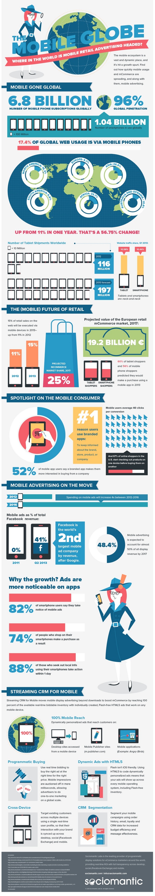 Alors que Sociomantic Labs a annoncé le lancement de Streaming CRM Mobile, la première solution de publicité display dynamique sur mobile en HTML5, le groupe a réalisé une infographie révélant l'ecosystème du marché du mobile et les perspectives du m-commerce. Certains chiffres démontrent bien l'ampleur du phénomène puisqu'à ce jour le taux d'équipement serait colossal et plus qu'à maturité. En effet, 1,04 milliards de smartphones seraient utilisés dans le monde. 17,4% de l’accès Internet dans le monde se fait via les téléphones portables et les continents Africain (23,7%) et asiatique (26.6)% sont les grands utilisateurs de l'internet via smartphone contre 9.7% en Europe.