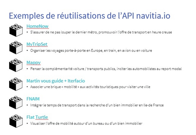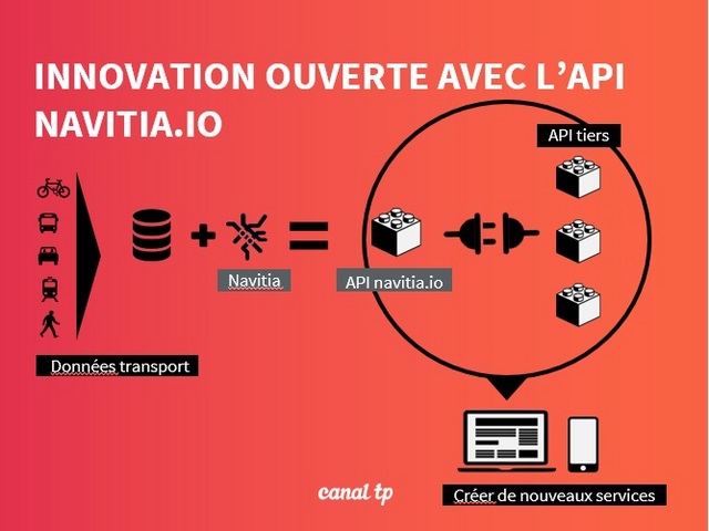 Mais depuis plus d’un an, Canal TP a développé une API (Application Programming Interface) autour de Navitia, elle s’appelle Navitia.io : elle cumule le logiciel Navitia et quantité de données de transport comme celles de Vélib, de Transilien SNCF ou encore de la RATP. En open source, cet API permet ainsi à n’importe qui de contribuer, de signaler un bug, de le corriger, de le développer et surtout de créer de nouveaux services qui intègrent la mobilité.