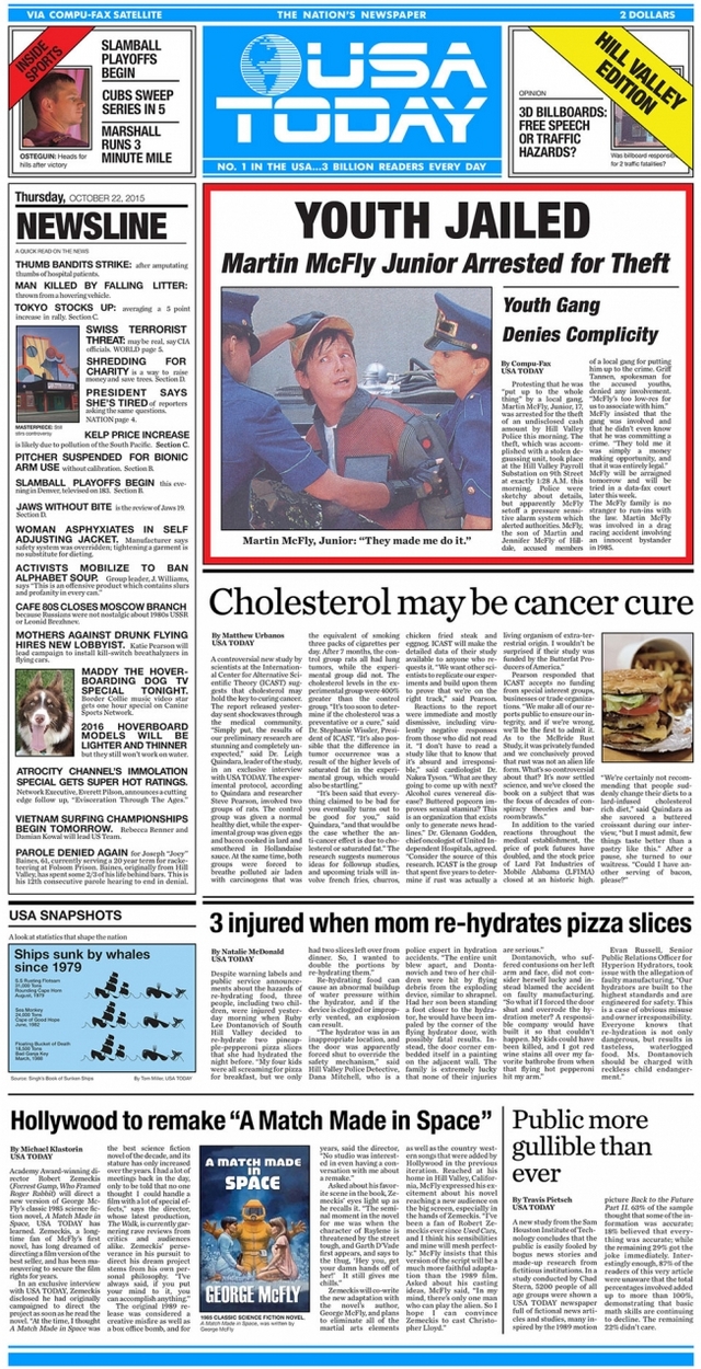 Pour voir la conséquence des actions de Doc et Marty sur la tournure des divers événements, les protagonistes se fient à la Une de USA Today. Le journal a choisi de sortir une pré-couverture dédiée, qui reprend les infos imaginées lors du tournage du film.