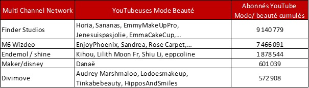 Cumul des abonnés Youtube des chaines mode beauté des principaux MCN français