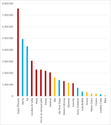 Alors que les médias et les célébrités créent sur les réseaux sociaux une relation basée sur la diffusion d’informations, les YouTubeuses développent une relation plus forte avec leurs publics en se positionnant sur le lien et l’échange. Cette proximité se traduit directement par l’engagement généré autour de leurs contenus : les 8 YouTubeuses (Enjoy Phoenix, Emmy MakeUp Pro, Caroline & Safia, Je ne suis pas jolie, Sananas, Horia, Emma CakeCup, Sweetie) représentent à elles seules près de 70% des interactions générées par les 21 YouTubeuses, médias et personnalités étudiés.