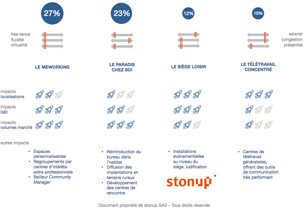 Dans son étude « Les 8 scénarios du Bureau 2030 » , la société Stonup tente de déterminer la forme des bureaux à long terme. Selon elle, quatre scénarios majeurs se détachent : le « meworking » ; le « paradis chez soi » ; le « siège loisir » et le « télétravail concentré » .