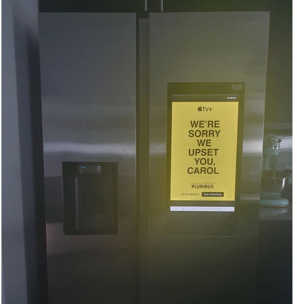 Pour le média Ars Technica, cette offensive s'explique par la captivité des utilisateurs : contrairement aux smartphones où l'on peut installer un bloqueur de pub, impossible d'échapper aux annonces quand elles colonisent votre cuisine. Sur Reddit, la colère est froide, elle aussi, mais bien réelle : « C'est comme perdre le contrôle d'un produit pour lequel vous avez payé le prix fort », rage un utilisateur sur le réseau social, où les menaces de boycott se multiplient. Une publicité pour Pluribus, la série Apple TV+ – affichant le message « WE'RE SORRY WE UPSET YOU, CAROL » – a même généré ce qui était, selon toute vraisemblance, un hoax : un post affirmant qu'une femme prénommée Carol avait été hospitalisée après avoir vu cette pub sur son frigo, déclenchant un épisode psychotique. La façon dont cette histoire a été reprise par la presse montre toutefois que le sujet touche un nerf.