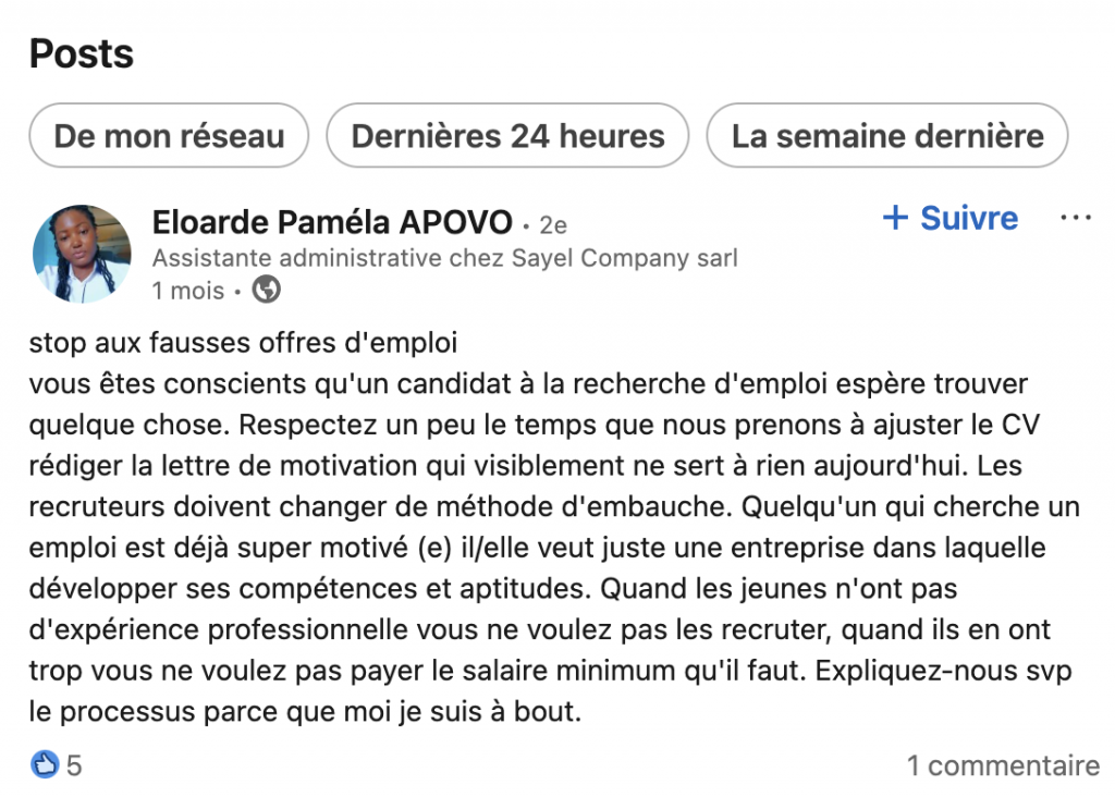 Si cela ne fait que 3 mois qu’elle cherche du travail dans les secteurs de la finance, de la gestion de stock et même de l’assistanat, Eloarde Pamela Apivo a été plusieurs fois confrontée à de fausses annonces. « Je vais y postuler ce mois-ci et deux mois après, la même offre revient. Je ré-renvoie ma candidature et je n’ai jamais de retour. Il y a un problème », fustige celle qui a publié son post LinkedIn parce qu’elle se dit « frustrée », « énervée » et « mal en point ».
