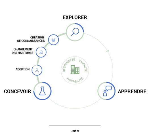 Pour l’organisation, il s’agit finalement d’adopter en cycle court les capacités d’exploration, d’apprentissage et de conception (cf modèle wds d’exploration - apprentissage - conception complètant le modèle stim) comme vu dans l’article précédent sur la génétique des objets. Les entreprises ont 3 enjeux de conception :
