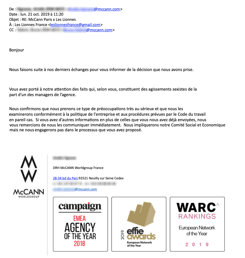 - La rédaction d’un e-mail commun rédigé par McCann Paris et Les Lionnes à diffuser à l’ensemble des salariés, afin de présenter une enquête sur des faits de harcèlement sexiste au travail