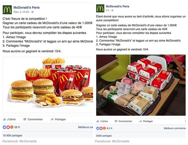 Pour attirer un maximum de monde, les faussaires ont invité les participants à partager la page. Ce faux jeu concours a été partagé plus de 20 000 fois avant d’être supprimé par McDonald’s qui a précisé n’avoir rien à voir avec ce concours crapuleux.