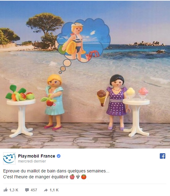 Sexisme, mauvais enseignement aux enfants… En postant cette photo sur Facebook, Playmobil était loin d’imaginer la tournure que cela prendrait. Sur la publication, deux figurines féminines. L’une mange une glace, l’autre des fruits en s’imaginant en maillot de bain. En inscrivant comme légende : « Epreuve du maillot de bain dans quelques semaines... C'est l'heure de manger équilibré » la marque de jouets pensait s’inscrire dans l’actualité. Mais les internautes n’ont pas tardé à crier au sexisme et à la promotion du régime dès le plus jeune âge.