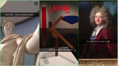 Le musée de Los Angeles, LACMA, a récemment utilisé l’application Snapchat pour démocratiser l’art auprès d’un public de millenials. L’objectif est de donner envie de se rendre au musée et de partager ce qu’il s’y passe en proposant une lecture décalée de leurs collections, plus proche du quotidien des utilisateurs de la plateforme sociale. Une initiative particulièrement efficace et virale adaptée à un public devenu son propre media, habitué au social sharing, toujours détaché de l’instant présent en étant connecté ailleurs.