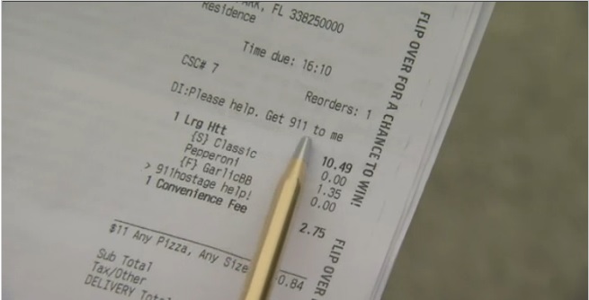A la réception de la commande, les employés de la chaîne de restauration ont eu la surprise de découvrir parmi la liste d’ingrédients demandés pour la composition de la pizza ce message : « 911 hostage help ». La police du Comté a aussitôt été alertée et son intervention a permis d’arrêter Ethan Earl Nickerson, le compagnon.