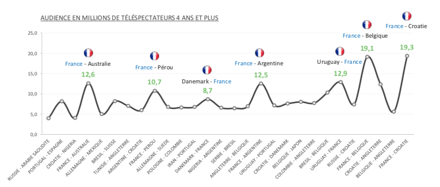 L'audience de la finale représente le meilleur score de 2018. C'est également le plus haut depuis la finale de l'Euro 2016. Pourtant, les 19,3 millions de téléspectateurs de la finale se placent à la 9e position historique. Loin devant, la demi-finale Portugal-France en 2006 avait rassemblé 22,2 millions de téléspectateurs.