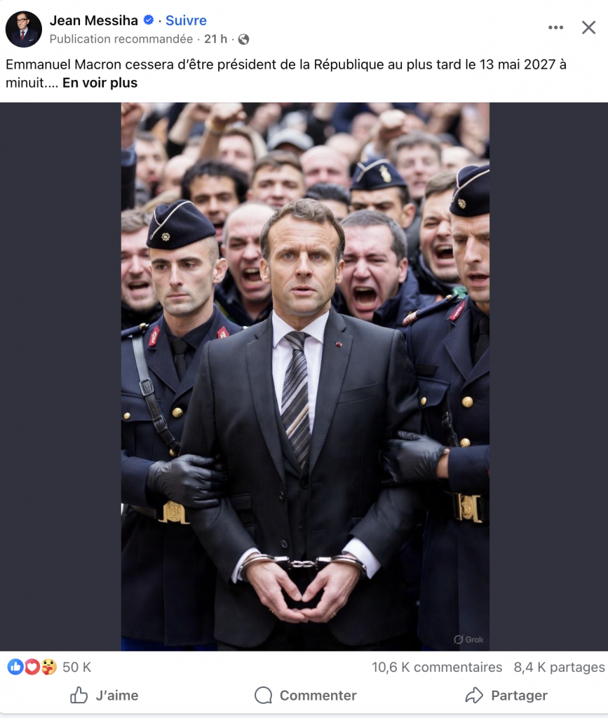 Publiée le 10 décembre 2025 sur Facebook, la vidéo a rapidement cumulé plus de 13 millions de vues et gagné suffisamment en visibilité pour que le président l’évoque publiquement lors d’une rencontre avec les lecteurs du journal La Provence. Prévenu par « un collègue africain », Emmanuel Macron aurait demandé, via la plateforme Pharos, le retrait de cette vidéo virale. Toujours d’après le président, Meta aurait refusé d’accéder à cette demande au motif que cette vidéo ne « contreviendrait pas à ses règles d’utilisation ». Quelques heures après ces déclarations, le constat semble toutefois plutôt mitigé. Une partie des copies de cette vidéo semble avoir été retirée de la plateforme, mais d’autres versions, légèrement modifiées (parfois mises en accéléré), semblent être encore en ligne sur Facebook, tandis que la propagation se poursuit sur d’autres plateformes comme TikTok.