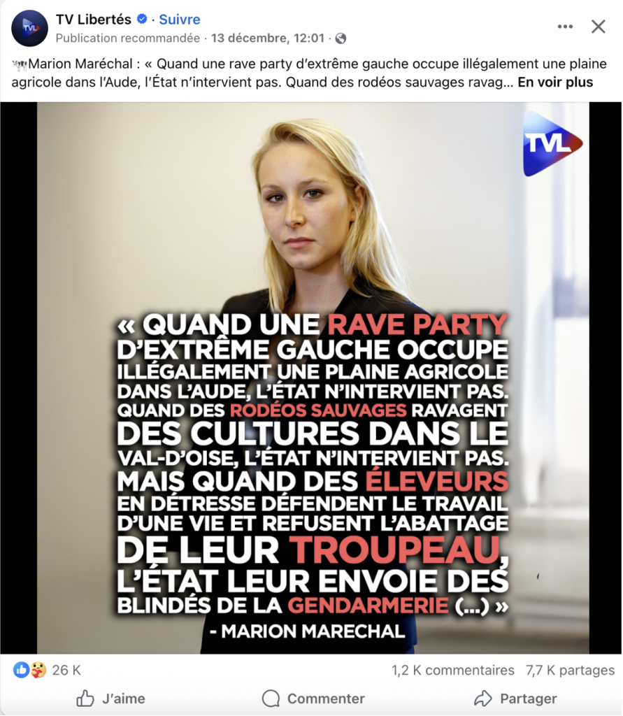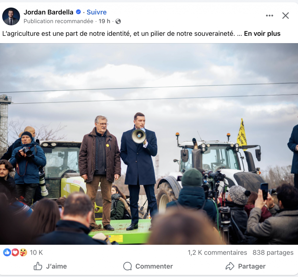 En parallèle, on trouve énormément de posts mettant en avant des personnalités d’extrême droite, particulièrement Jordan Bardella et Marine Le Pen. Les deux responsables politiques sont présentés comme des alliés naturels des agriculteurs, qui s’opposent notamment à l’accord de libre-échange entre l’Union européenne et le Mercosur. Cette hyperprésence médiatique est soutenue par d’autres personnalités comme Philippe de Villiers, Éric Zemmour, Florian Philippot, Marion Maréchal-Le Pen, ainsi que d’autres influenceurs connus des sphères anti-pass sanitaire et complotistes, comme Gilbert Collard, Jean Messiha ou Olivier Rouhaut (plus connu sous le pseudo d’Oliv Oliv).