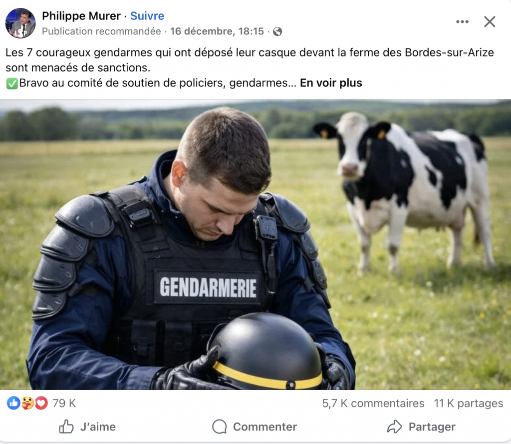 Enfin, la plateforme continue de diffuser des fake news, comme cette fausse vidéo de coup d’État, mais aussi une histoire de sept gendarmes qui auraient refusé de monter à l’assaut de la ferme de Bordes-sur-Arize le 12 décembre dernier. À l’aide d’images d’archives ou générées par IA, de nombreux comptes et personnalités politiques d’extrême gauche rendent hommage à ces fameux gendarmes qui auraient « baissé leurs armes en soutien aux agriculteurs » et qui seraient à présent sous la menace de « sanctions ». Sur le site officiel de la gendarmerie nationale, les faits sont toutefois présentés d’une autre manière : si des vidéos montrant des gendarmes retirer leur casque et baisser leur bouclier existent bien, il s’agit avant tout d’une stratégie de désescalade, et non d’un refus d’obéir.