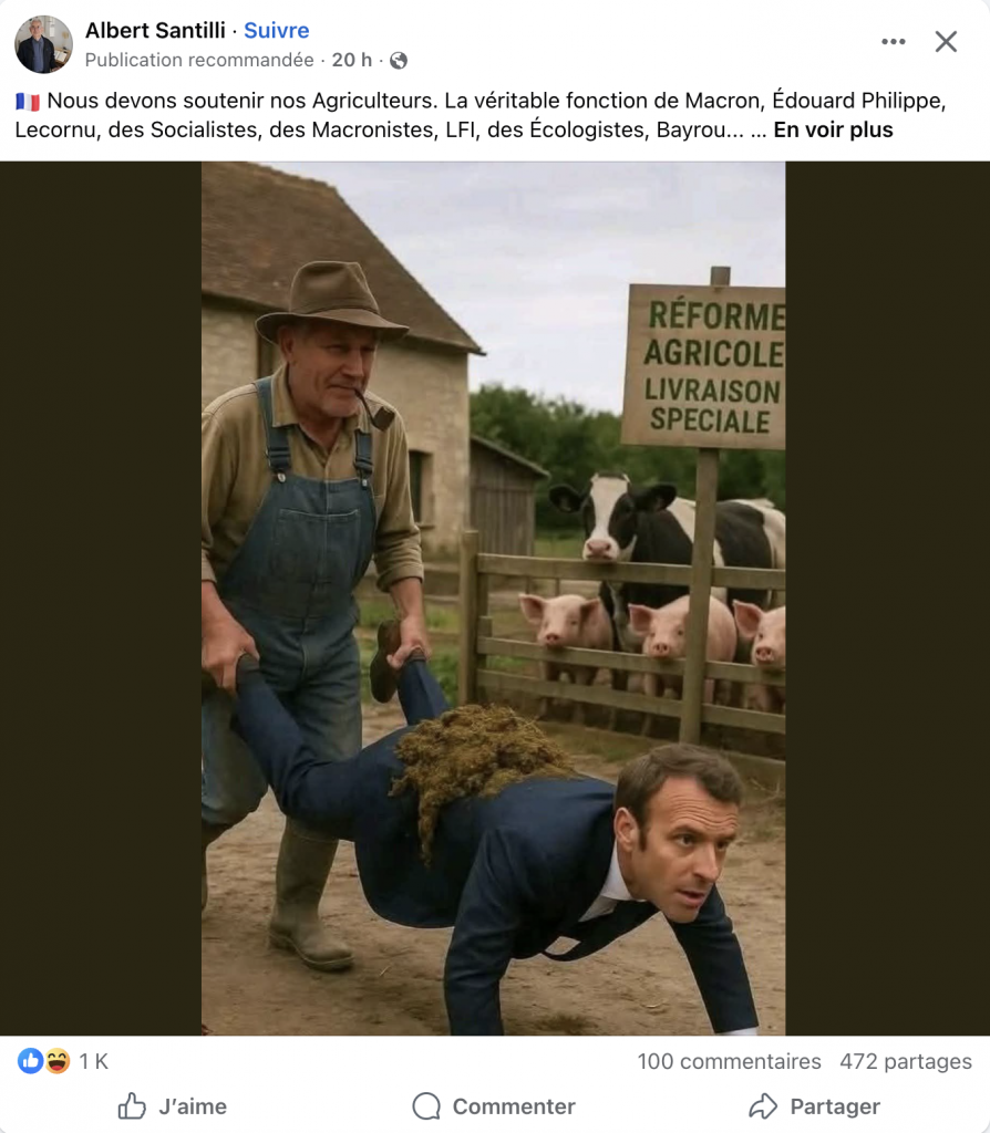 Plus qu’une simple vidéo générée par IA mettant à mal Emmanuel Macron — Facebook regorge de contenus slop. Depuis deux ans maintenant, l’orientation générale du fil d’actualité a dérapé. Pour s’en rendre compte, il suffit de scroller quelques heures via un compte Facebook vierge, sans amis ni aucune interaction, afin d’observer où mène l’algorithme de recommandation de contenus. Dans un contexte de fortes tensions dans le monde agricole, causées par les abattages réglementaires de troupeaux touchés par la dermatose nodulaire, le réseau social semble bouillonner d’une colère et de revendications identitaires qui rappellent les épisodes des Gilets jaunes ou des confinements liés au Covid. Les images, réelles mais aussi synthétiques, illustrant la situation agricole sont omniprésentes et critiquent très clairement le pouvoir.
