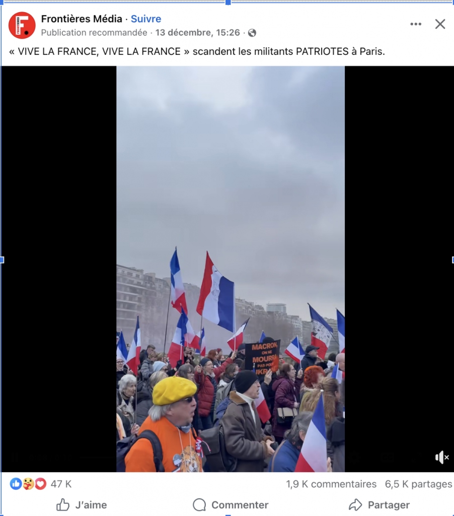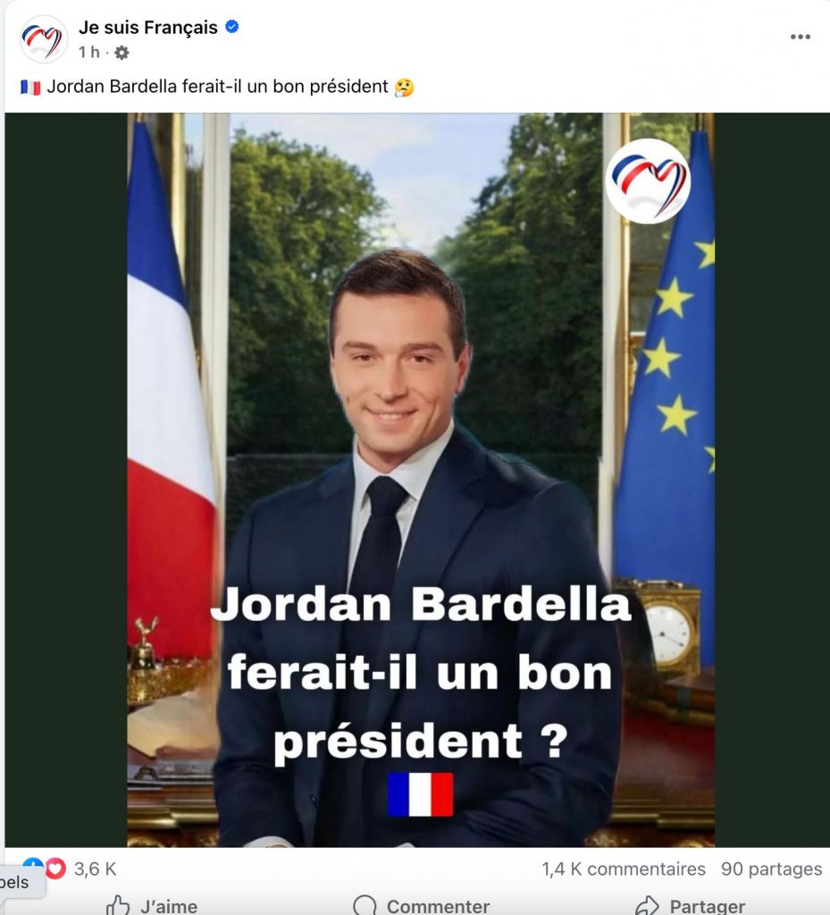 S’ajoutent à cela d’autres médias plus orientés ou controversés comme Cerfia, Frontières ou TV Libertés. Le premier est un compte X à l’origine, devenu une marque média rachetée par l’entrepreneur milliardaire et financeur d’influenceurs catholiques et suprémacistes Pierre-Édouard Stérin. Le deuxième est un magazine et une chaîne YouTube orientés à l’extrême droite, dont le travail est plus proche de l’agit-prop (une forme de propagande visant à influencer les opinions politiques) que du journalisme. Le troisième est une web TV et un compte YouTube lancés par Philippe Milliau, ancien dirigeant du mouvement d’extrême droite Bloc identitaire. Facebook propose aussi des contenus postés par des pages plus « exotiques » comme « Fiers d’être Français » (357 000 abonnés) ou « Je suis Français » (1,2 million d’abonnés), dont les publications sont surtout composées de mèmes identitaires et de posts à la gloire de Jordan Bardella.