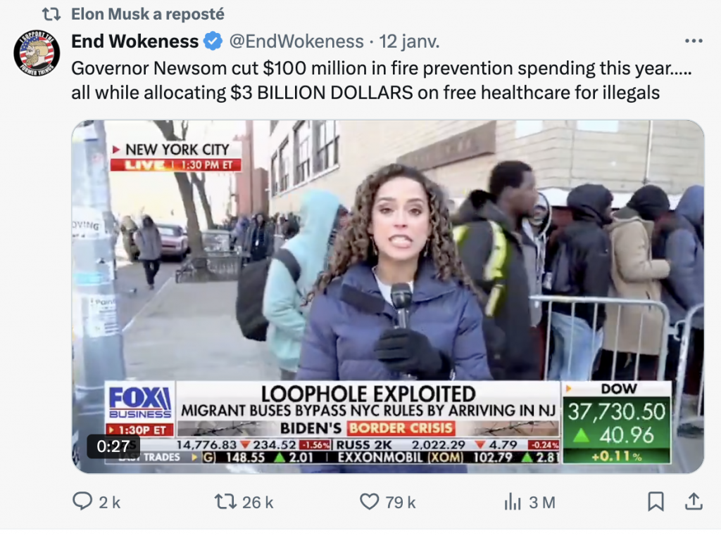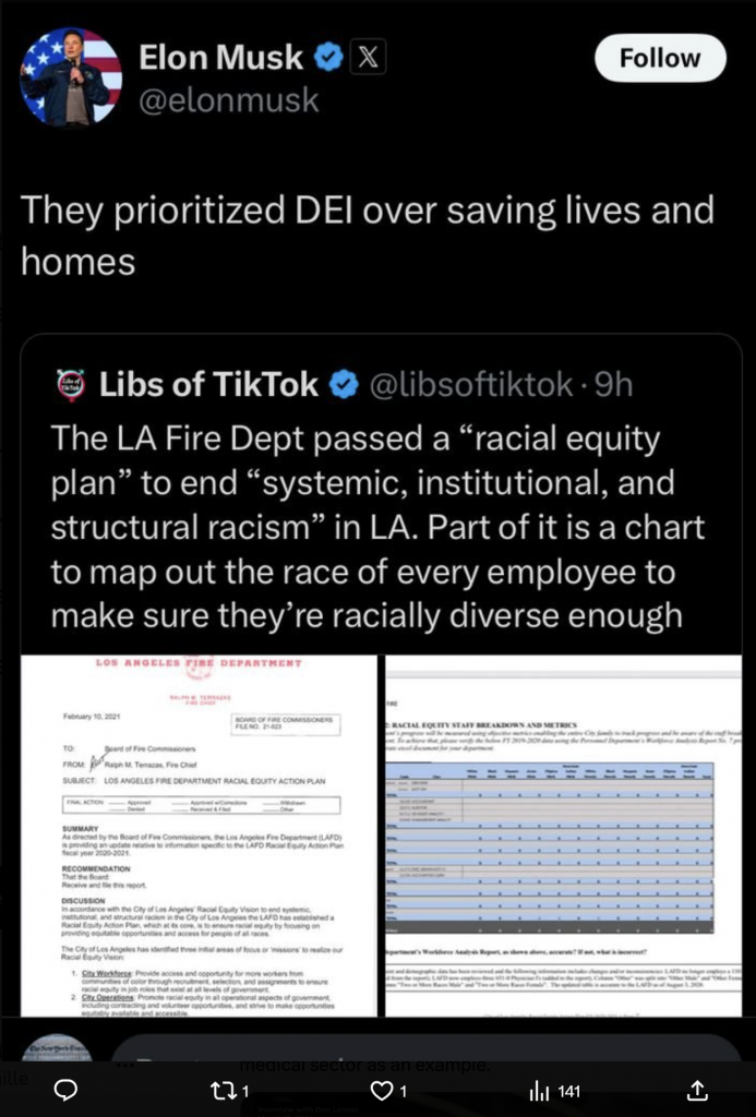 Il y accuse le gouverneur Newsom d’avoir coupé le budget de la prévention des incendies de 100 millions de dollars tout en donnant plus de 3 milliards de dollars pour l’assurance santé des immigrés illégaux, a minimisé le rôle du dérèglement climatique, a validé les thèses délirantes d’Alex Jones d’un complot mondial lié à une guerre économique et, surtout, a dénigré plusieurs fois les programmes de diversité, d’équité et d’inclusion (DEI) menés au sein des brigades de pompiers de Los Angeles. Une pensée que l’on pourrait traduire par la phrase suivante : s’il y avait plus d’hommes blancs chez les soldats du feu, l’incendie aurait été maîtrisé depuis longtemps.