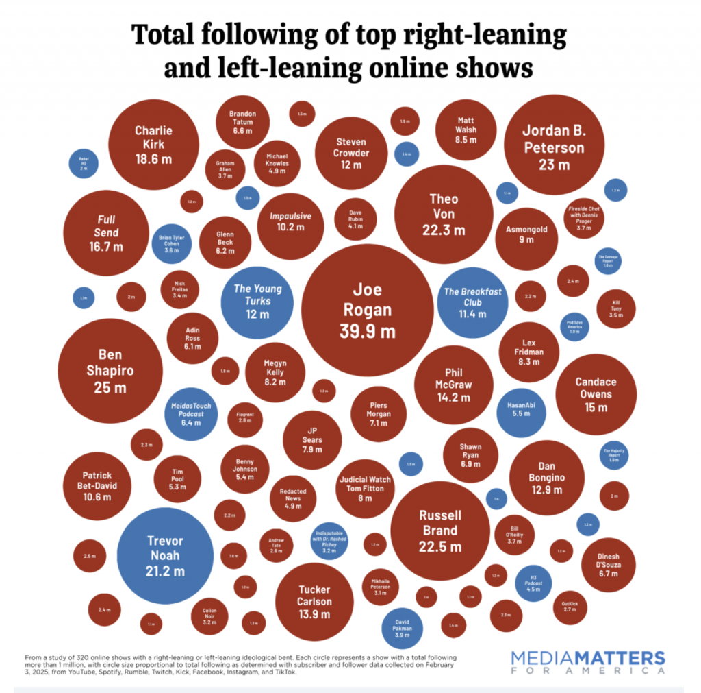 En zoomant sur l’orientation politique de ces émissions, l’étude de Media Matters révèle que 191 d’entre elles penchent à droite, tandis que 129 sont plutôt de gauche. S’ajoute à cela une asymétrie d’audience totale, avec un cumul de 480,6 millions d'abonnés pour les émissions de droite, soit un résultat cinq fois plus important que pour les émissions de gauche, qui ne cumulent que 104 millions d’abonnés.
