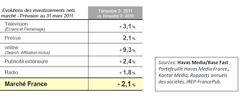MPG Fast (Havas Media) prévoit une progression de +2,1% au 2nd trimestre pour le marché publicitaire. Selon l'agence la télévision et Internet tirent le marché tandis que la presse réduit ses pertes. La croissance prévue de 1.8% de la radio et de 2.4% pour l’affichage, est à replacer dans le contexte de la relative amélioration que connaissent ces deux media depuis 2010.