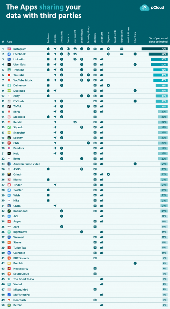 Avec des publicités sur Instagram de plus en plus ciblées - parfois même sur nos conversations orales - Instagram fait partie des applications qui vendent le plus nos données. D’après la plateforme de stockage en ligne Pcloud, le réseau visuel partage jusqu'à 79 % de nos données personnelles à des services tiers.