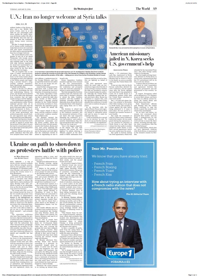 Cette année, la rédaction de la station du Groupe Lagardère a très envie d'une Grande Interview, celle du Président des Etats-Unis, Barack Obama. Elle a donc, comme l'exige la profession, fait une demande officielle d'interview auprès de l'Ambassade des Etats-Unis à Paris, mais aussi de la Maison Blanche. Pour faire connaître au Président leur grande motivation, la station de la rue François 1er, a également fait paraître dans le numéro du Washington Post du 21 janvier, une annonce directement adressée à Barack Obama pour appuyer sa demande: le visuel use de jeux de mots "with French" et garantit une interview avec "une station de radio française qui ne transige pas avec les infos". Cette annonce a fait l'objet d'un échange media. Peut-être prochainement, le Washington Post communiquera-t-il sur les ondes d'Europe1...