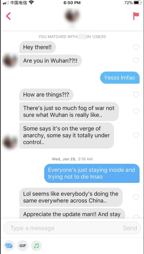 Setting my tinder to Wuhan so I can get the real scoop on what’s going on