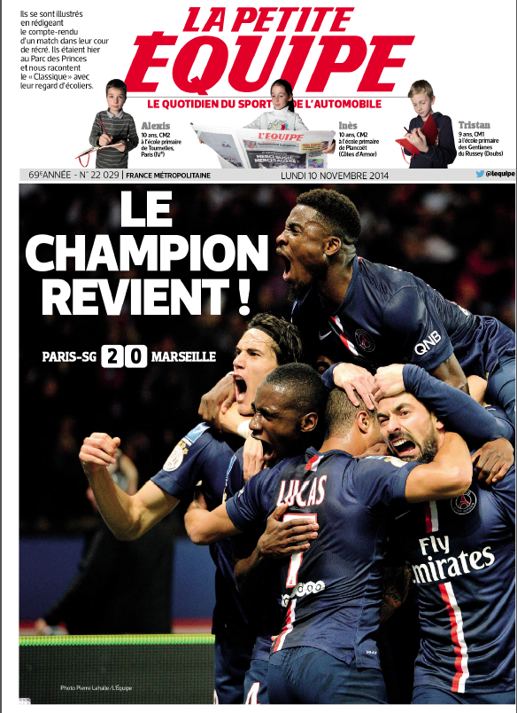 C'est sous la forme d'une feuille de cahier, avec les lignes bleues et la marge en rouge que le communiqué de presse est parvenu lundi. Ecrit par Tristan (9 ans), Alexis et Inès (tous deux 10 ans), ils annoncent leur sélection par les journalistes de l'Equipe pour la rédaction du compte rendu du classico PSG-L'OM qui a eu lieu dimanche soir. Les petits chanceux ont été invités au Parc de Princes pour commenter le match en direct, ont interviewé Laurent Blanc et leur plume est en une du journal du 10 novembre, rebaptisé pour l'opération "La Petite Equipe".