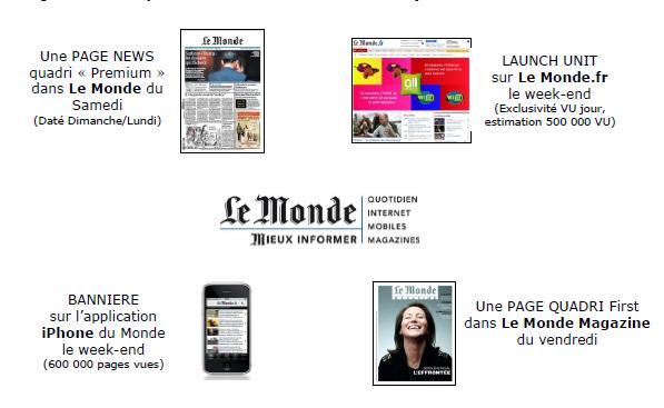 Dans ce cadre, Le Monde et I-Régie lancent la première offre quadruple play. Baptisée 4PLAY (FourPLAY), cette offre associe des emplacements premium sur tous les supports de la marque Le Monde : quotidien, magazine, site Internet, application Iphone et permet une très forte visibilité tout au long du week-end pour un tarif de 44 000 € HT net espace*