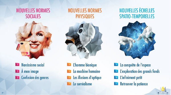 Concernant les Nouvelles Normes Physiques, l'étude présentait 4 tendances correspondant à de nouvelles représentations de l’homme et du monde. L’homme devient augmenté et parallèlement les robots s’humanisent.