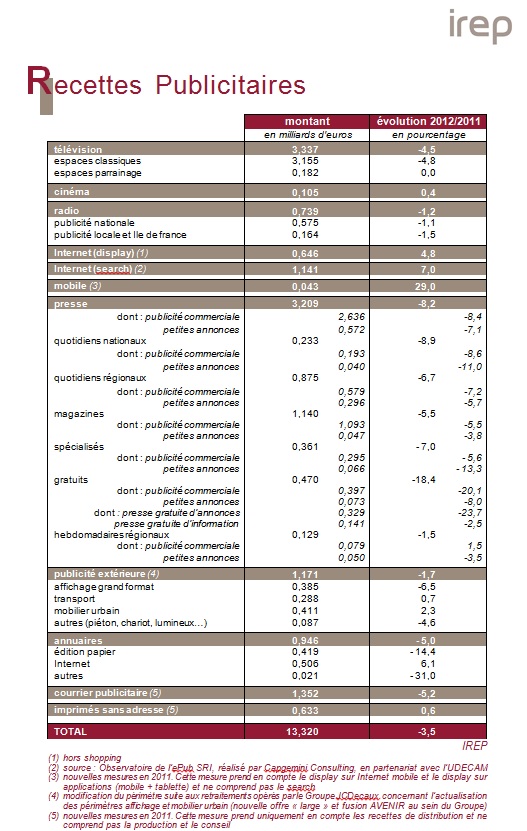 En 2012, le marché publicitaire connait de nouveau une baisse notable. L'IREP révèle côté media, -3.5% de recettes publicitaires et France Pub -1.3% des dépenses de communication des annonceurs. France Pub table sur une prévision de -1.5% sur 2013.