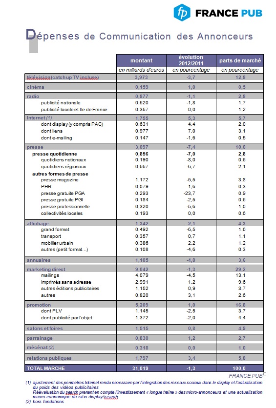 Les dépenses de communication des annonceurs représentent 31 milliards €. Elles ont relativement bien résisté à la crise économique en 2012, étant en baisse de - 1,3% (vs + 1,9% en 2011, + 3,4% en 2010 et - 8,6% en 2009). Pour Xavier Guillon, directeur général de France Pub : " il s'agit d'une bonne nouvelle qui démontre que malgré la crise, les annonceurs ont poursuivi leurs investissements et ont souhaité maintenir le niveau de dépenses des ménages". Ces résultats révèlent par ailleurs le recul plus net sur les cinq médias historiques (- 4,4%), tous en baisse hors le cinéma. A l’inverse, l’ensemble marketing direct, promotion et événementiel est pratiquement resté stable. La progression d’Internet est ralentie (+ 5,3%). Les RP affichent une progression de 3.4%.