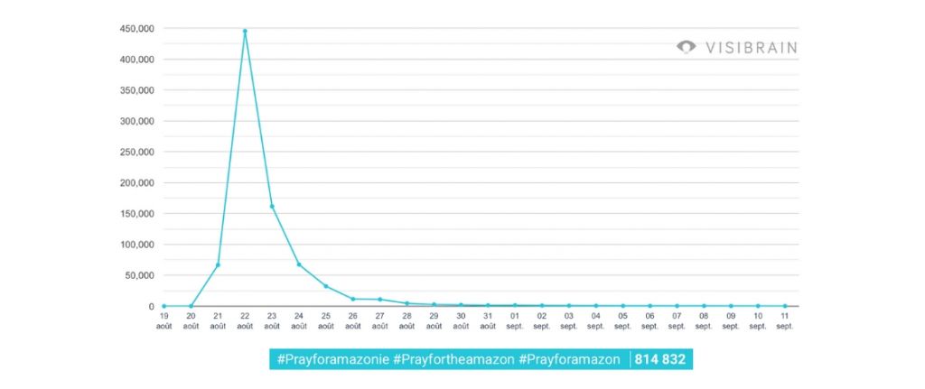 Ce phénomène de « chasse d'eau » qui montre un pic brutal de mobilisation et sa disparition rapide se retrouve fréquemment. On peut aussi l'observer pour les hashtags #Prayforamazonie, #Prayfortheamazon ou #Prayforamazon qui sont apparus un peu partout dans le monde à la fin du mois d'août 2019. Le mouvement a généré plus de 814 000 tweets contenant ces hashtags, mais la mobilisation n'a duré que 6 jours en tout. Pour rappel, les feux qui consomment la forêt amazonienne ont lieu quasiment toute l'année.