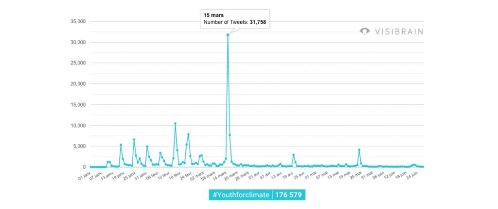 Peu importe les chiffres en ligne, les courbes tendent à montrer les manifestations IRL entraînent une mobilisation sur la durée. C'est particulièrement frappant avec le hashtag #YouthForClimate lancé par la militante Greta Thunberg.
