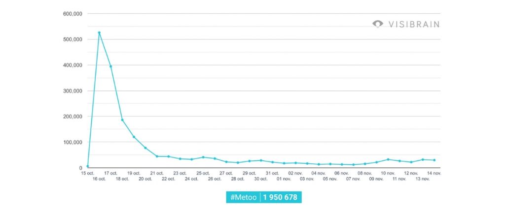 Le mot-clé ne bénéficie pas de l'effet « Trending Topic » comme les précédents, mais avec seulement 44 507 tweets au compteur, des pics d'activité ressurgissent de manière plus régulière, montrant qu'il s'agit d'un mouvement qui s'inscrit dans la durée. Reste à espérer qu'il soit suffisamment impactant pour changer la société en profondeur.