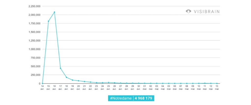 C'est notamment le cas du hashtag #NotreDame. D'après notre partenaire Visibrain, le mot-clé se place en tête du nombre de retweets avec plus de 4,96 millions de mentions dans le monde. À titre de comparaison le seul autre hashtag qui s'approche d'un tel score est le #JeSuisCharlie qui avait mobilisé 4,94 millions d'internautes après l'attentat de la rédaction de Charlie Hebdo en 2015.