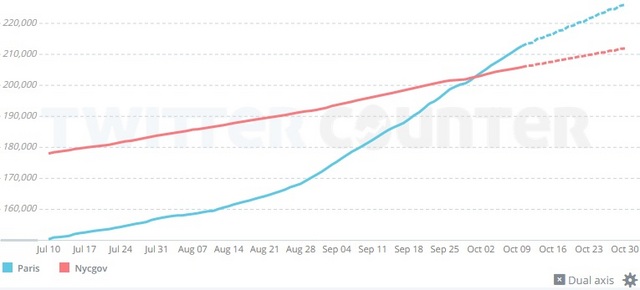 La ville de Paris gagne en moyenne 5 000 followers par semaine sur son Twitter @Paris. Aujourd’hui, ce ne sont pas moins de 224 000 abonnés (56% d’hommes 44% de femmes) qui suivent le compte officiel de la ville Lumière tandis que Big Apple en compte 209 115.