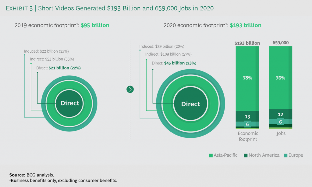 Le marché des vidéos courtes repose sur trois modèles économiques : la publicité, l'e-commerce et les achats directs via l'application. Le BCG estime que le marché entier est valorisé à hauteur de 193 milliards de dollars directement générés, dont 54 milliards de revenus. 36 milliards de dollars sont générés de manière indirecte dans l’industrie culturelle avec, à la clé, la création de 460 000 emplois. Attention cependant, 78% de l’argent généré (ainsi que 76% des emplois créés) le sont dans la zone Asie-Pacifique.