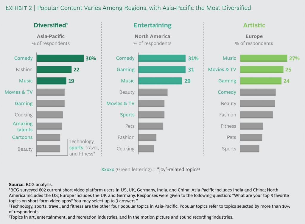 Format court oblige, la plupart des vidéos diffusées sur les trois plateformes mettent en scène du contenu engageant. L’humour, la musique, la mode ou bien encore les jeux vidéo sont les sujets les plus récurrents d’après l’étude. Mais contrairement à la plupart des vidéos vues sur le web, ces formats courts servent surtout à capturer un moment en particulier plutôt que de raconter une histoire. Elles permettent aussi de toucher les spectateurs sur plusieurs types d’émotions comme l’impression d'authenticité, l’inclusion à un groupe plus large, la reconnaissance des pairs ainsi que le niveau de bonheur général.