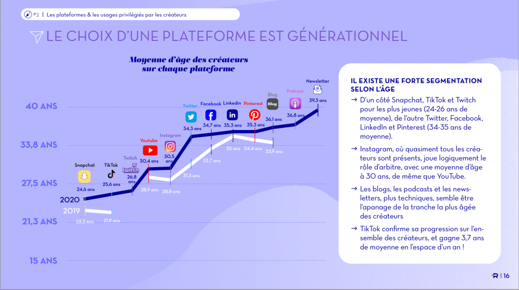 Instagram reste bien évidemment la plateforme favorite des influenceurs en 2020 avec une utilisation par 94% d’entre eux (elle reste aussi la plateforme privilégiée pour les partenariats avec les marques pour 84% d’entre eux). Cependant, TikTok continue sa progression fulgurante avec 41% des influenceurs qui se sont inscrits dessus cette année. Le réseau n’est toutefois pas le plus utilisé avec Pinterest, Twitter, YouTube, les blogs perso et Facebook qui sont encore devant. Eh oui, autre surprise de cette étude, les blogs restent le troisième format le plus utilisé. Reech apporte une autre nuance importante : le choix de la plateforme est bien évidemment corrélé à l’âge de ses utilisateurs, comme l’indique le graphe ci-dessous.