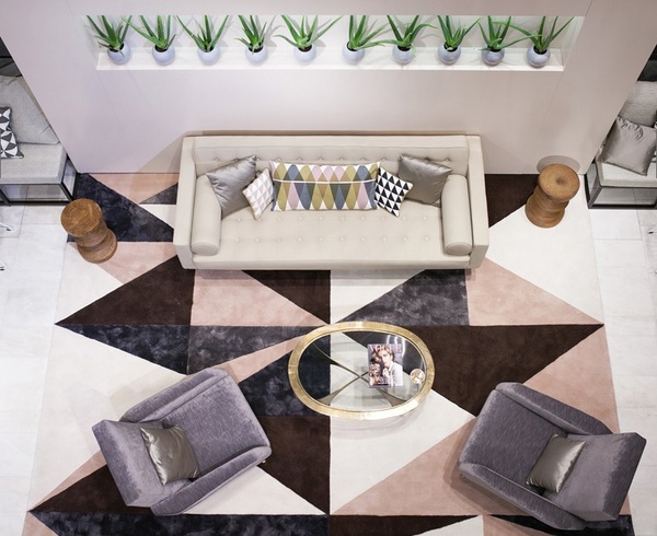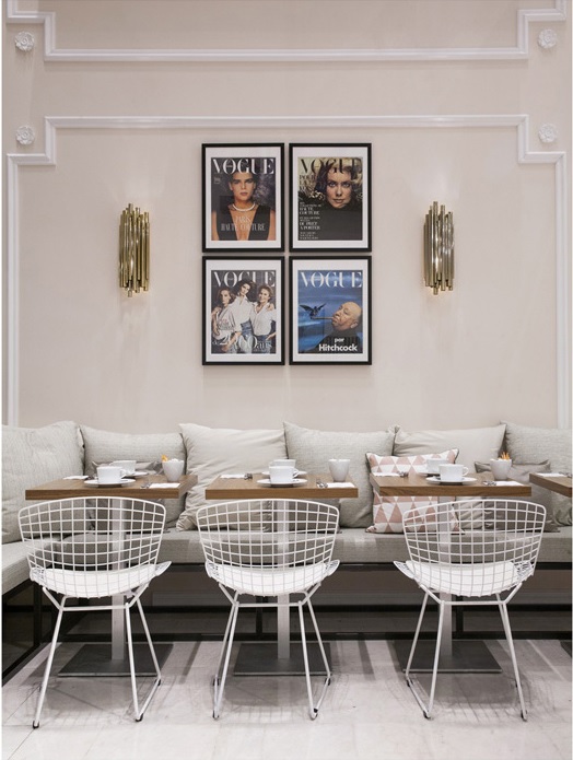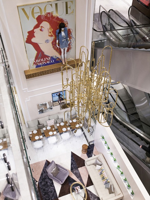 Le titre se met en scène au cœur du grand magasin dans un espace qui prend les allures d’un appartement confortable et chaleureux. Meubles scandinaves, ou années 50, sculptures du « mid century modern » américain, affiches des couvertures du magazine et mannequins habillés par la rédaction, composent le décor pour ce café à la mode. La maison Hugo & Victor a élaboré une carte spécifique avec « Formule du Poète » et autres gourmandises.