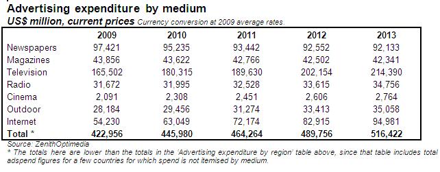 La télévision demeure la medium numéro 1 de loin, avec 189 630 millions de dollars d'investissements prévisionnels sur 2011 à 214 390 milllions de dollars sur 2013.