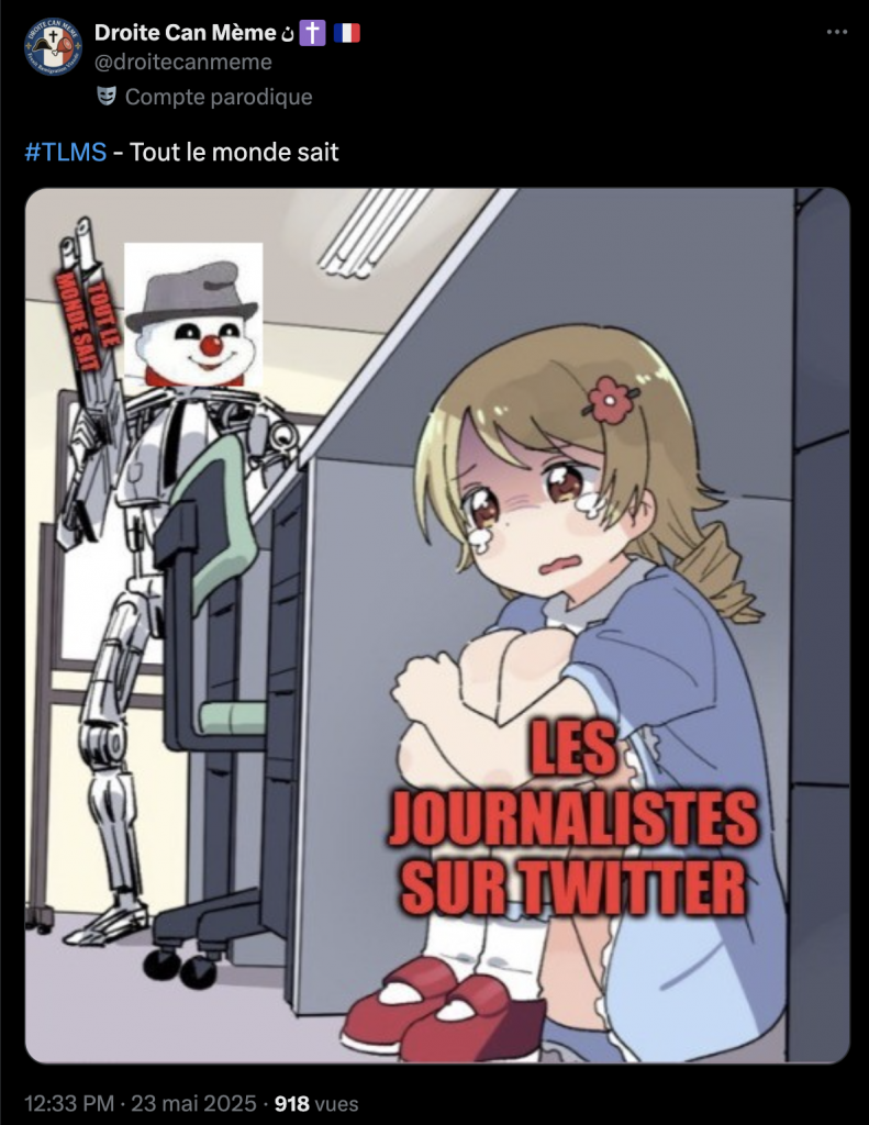 TLMS, un bonhomme de neige, Nicolas qui paie… Parlez-vous couramment l’extrême droite ? Sur X, les mèmes cantonnés à droite toute prolifèrent. Pas un tweet d’un média sur un fait divers sans que ne pleuvent les commentaires « Tout le monde sait », ou sa version acronyme, TLMS. Sous-entendu, tout le monde sait qui est l’auteur du délit : un immigré.