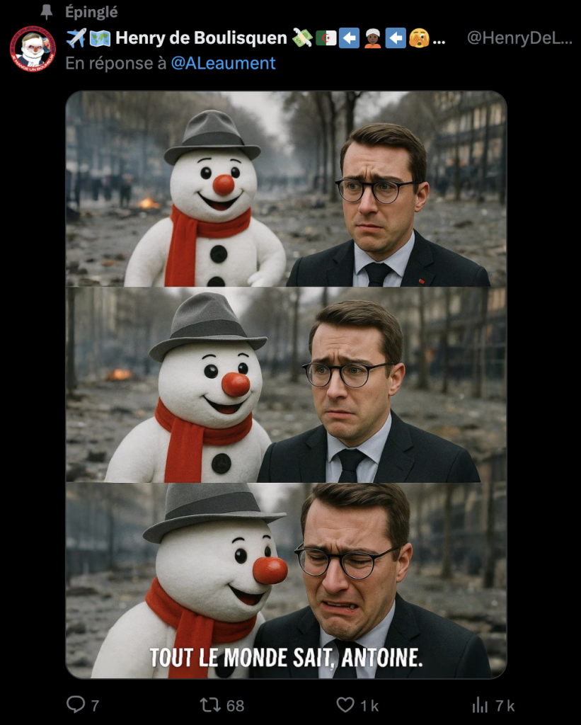 En cause, la photo de profil du compte X Bouli, un « gentil » bonhomme de neige à plus de 100 000 followers qui sous la formule « Tout le monde sait », impute le moindre fait divers de France aux Arabes. Avec les outils de génération d’image, ces petits bonshommes de neige qui paraissent mignons à première vue prolifèrent sur X.