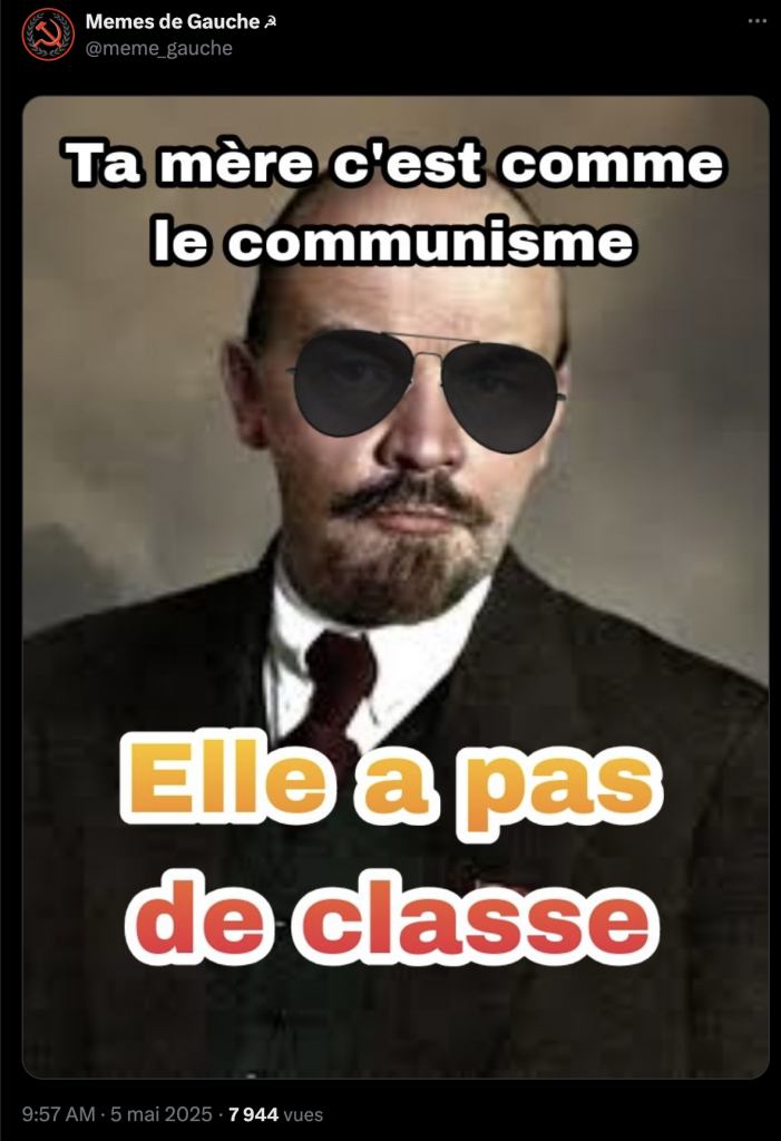 "Left cant meme" la gauche ne sait pas produire de meme, ça fait depuis le début d'internet que c'est comme ça.