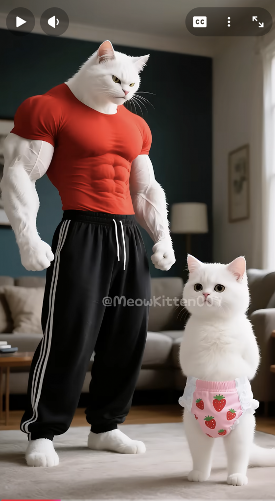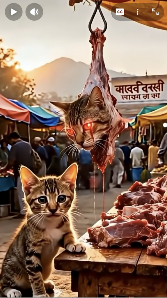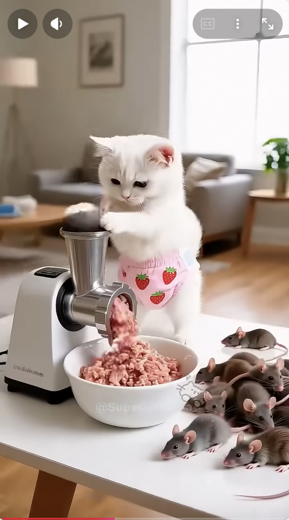 Un papa chat extrêmement musclé se retrouve blessé après avoir protégé son bébé. Pour pouvoir payer son opération, le bébé chat chasse des rats qu’il transforme en brochettes dans un grand hachoir avant de les vendre aux autres chatons. Grâce à l’argent, il peut payer l’opération de son père. Seulement voilà : les clients du bébé chat vomissent les brochettes à cause d’une intoxication alimentaire. La vidéo se termine sur le papa chat qui pleure en voyant son fiston menotté par la police, sur une reprise de musique mélodramatique faite à partir de miaulements. Et n’oubliez pas de liker et de vous abonner. Merci.