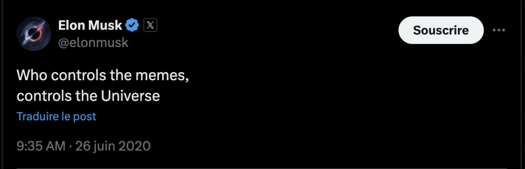 « Who controls the memes, controls the universe. » La formule date de 2020 et elle est de Musk. Elle explique sans doute pourquoi le milliardaire a voulu acheter Twitter. Pour contrôler et orienter ces images virales qui ruissellent sur Internet. Car oui, la pop culture la plus influente, celle qui sculpte notre conscience collective, celle qui dicte son agenda, vient désormais de là : des tréfonds du Web.