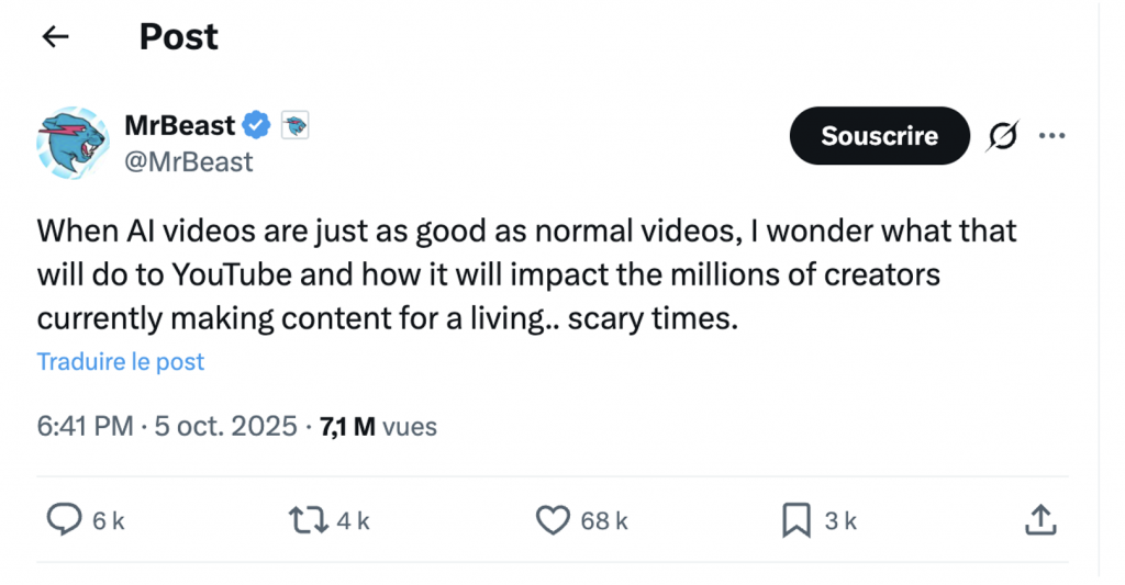 Mais cette théorie, à elle seule, ne suffit pas, d’autant qu’un autre facteur de perturbation est entré en jeu : l’arrivée massive des vidéos short générées par intelligence artificielle. Sur ce point, même MrBeast, qui domine pourtant la plateforme en matière de vues et d’abonnés, a annoncé son inquiétude. Le 5 octobre dernier, il déclare sur le réseau X être effrayé par la période actuelle, notamment après la sortie d’une plateforme comme Sora 2, qui permet de créer un contenu « aussi bon que des vidéos normales ». Pour les créateurs, le cauchemar, ce n’est pas seulement la concurrence des IA, c’est l’idée que l’algorithme puisse préférer des flux automatisés à des auteurs humains.